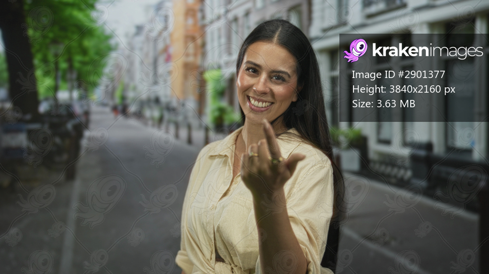 Woman beckons with finger and smiles warmly on a cobbled city street lined with buildings and trees; invitation welcoming.