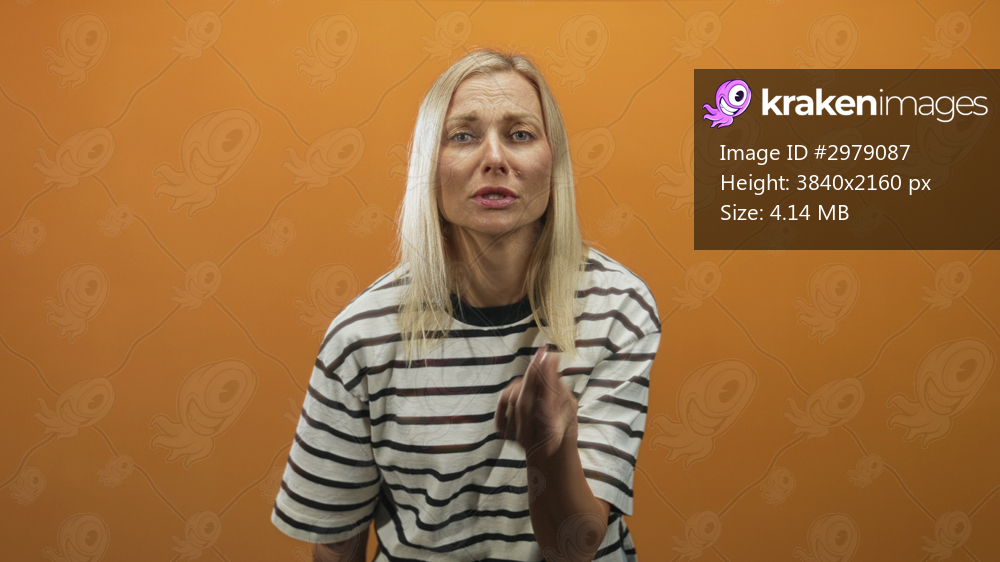 Woman beckons with fingers toward camera and later visibly rubs forehead in orange studio; plea frustration.