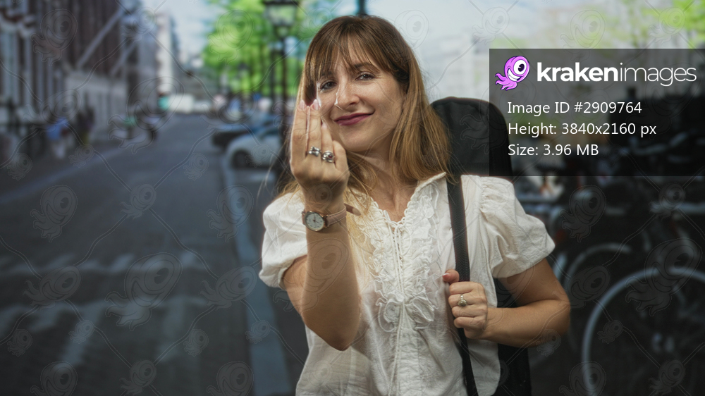 Woman beckons with hand and fingers while holding a guitar case on a busy city street lined with bicycles and parked cars; playful.