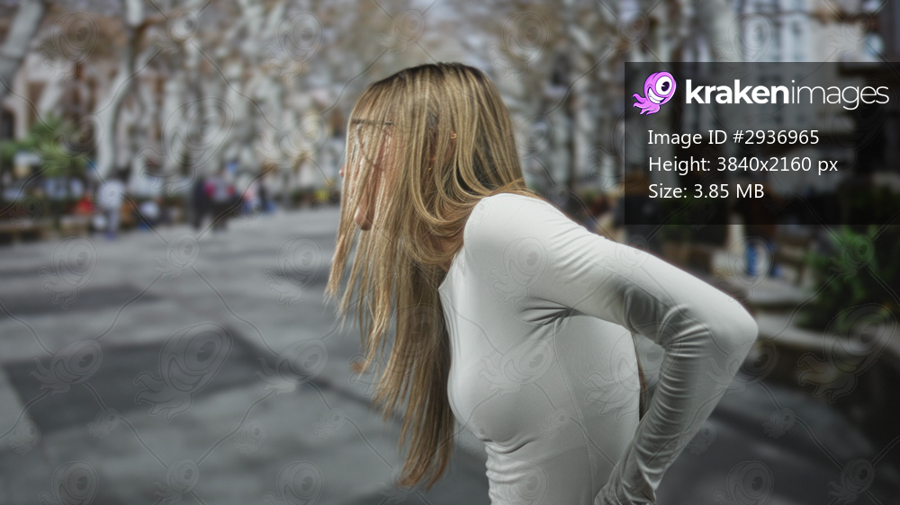 Woman bending forward with hands on lower back showing backache on a busy urban street plaza lined with benches and trees; discomfort.