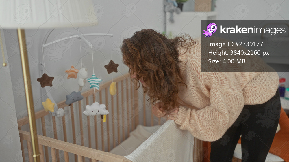Woman bending over crib in cozy bedroom with soft lighting, mobile toys hanging above, creating a serene nursery ambiance inside a modern home