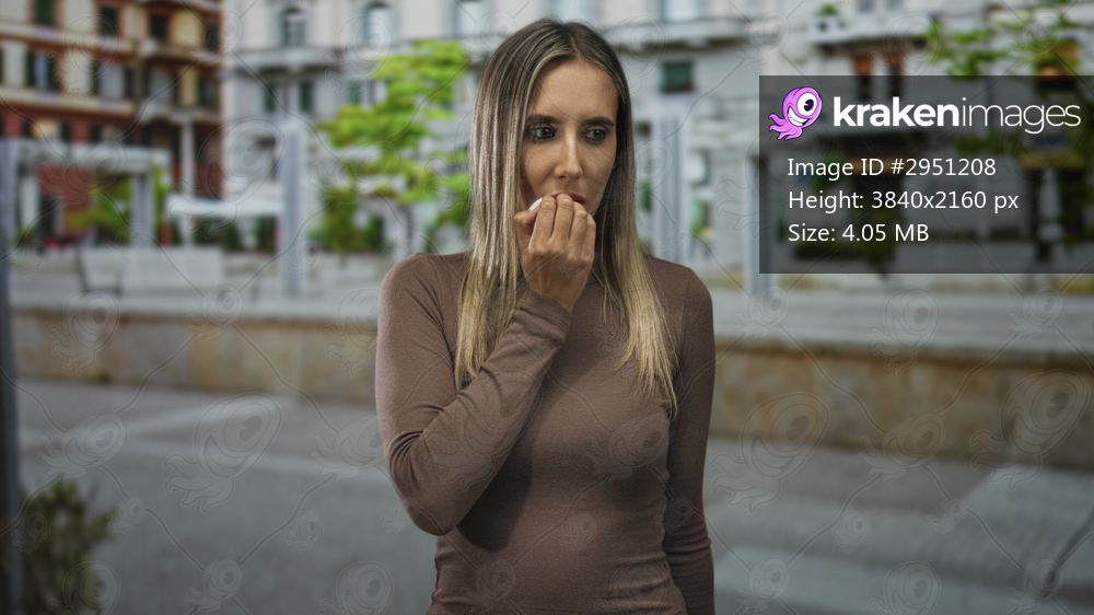 Woman bites fingernail with hand to mouth on a sunlit urban street plaza near buildings while glancing to the side; anxiety.