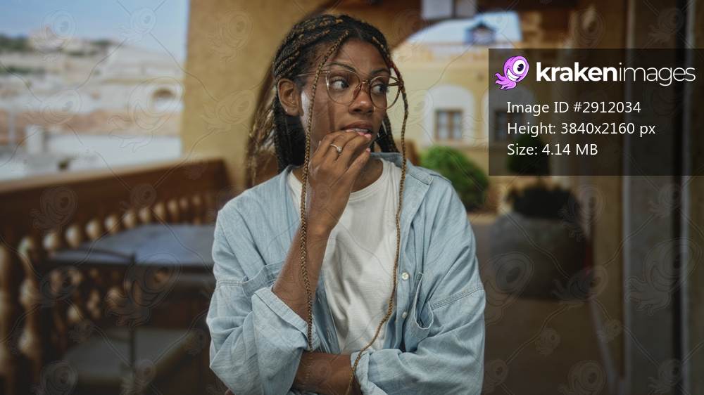 Woman bites fingernail and holds glasses while leaning on balcony railing in a building corridor, braided hair and denim shirt; uncertainty reflection. - Kraken Images