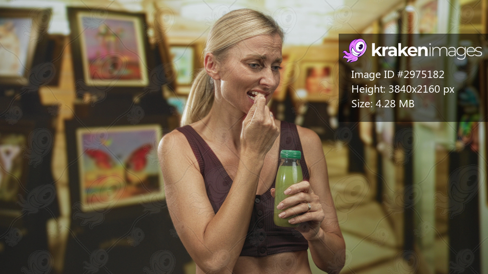 Woman bites fingernail while holding green juice bottle in studio filled with framed art and easels; anxiety hesitation.