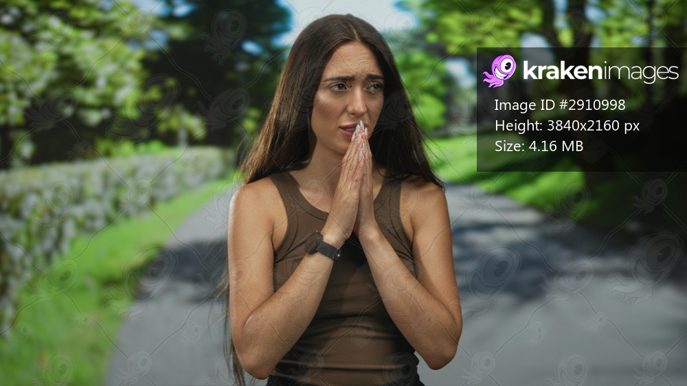 Woman bites fingernails and clasps hands in pleading pose on forest path; anxiety pleading introspection.