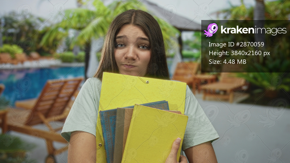 Woman bites lower lip clutching stack of binders by sunlit pool; study stress selfconsciousness uncertainty.