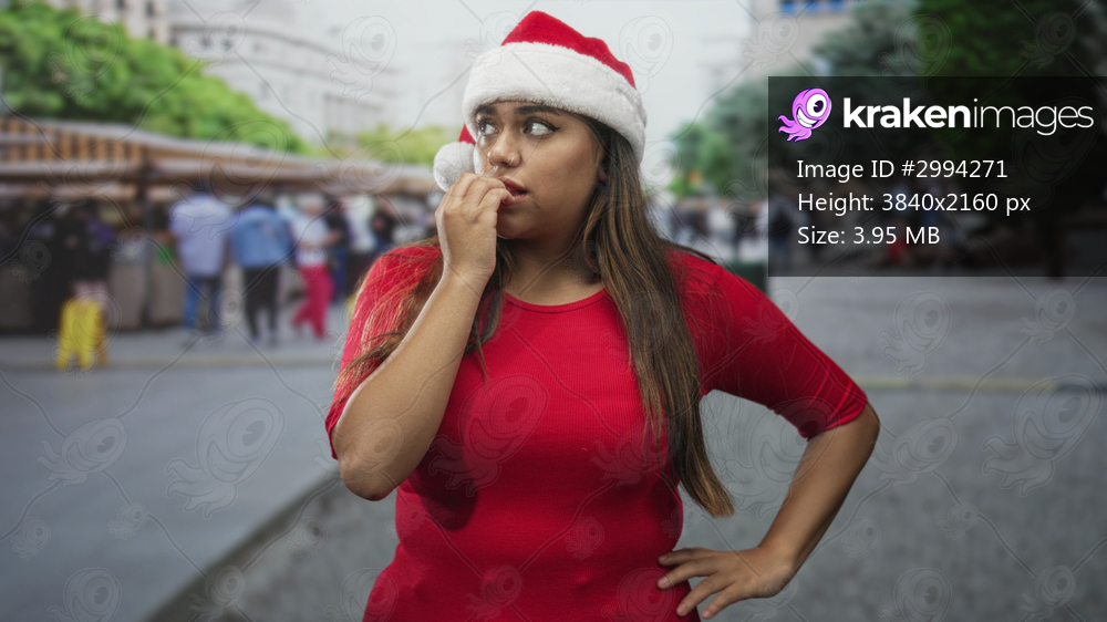 Woman biting fingernail with finger to mouth on street market wearing santa hat and red top; holiday anxiety.