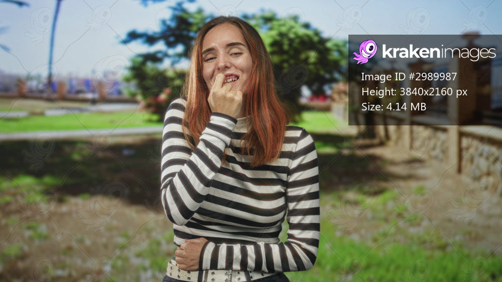 Woman biting fingernail with hand to mouth, eyes closed, striped top visible, standing near stone fence and park lawn on street; nervousness vulnerability. - Kraken Images