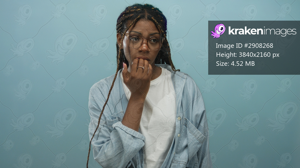 Woman biting fingernails with hand to mouth, wearing glasses and denim shirt in studio with blue backdrop; anxiety contemplation.