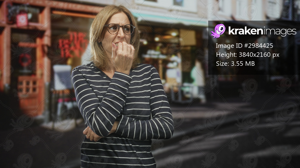 Woman biting her finger and clutching her other hand, wearing glasses and striped shirt in front of a storefront on a street; anxiety hesitation.