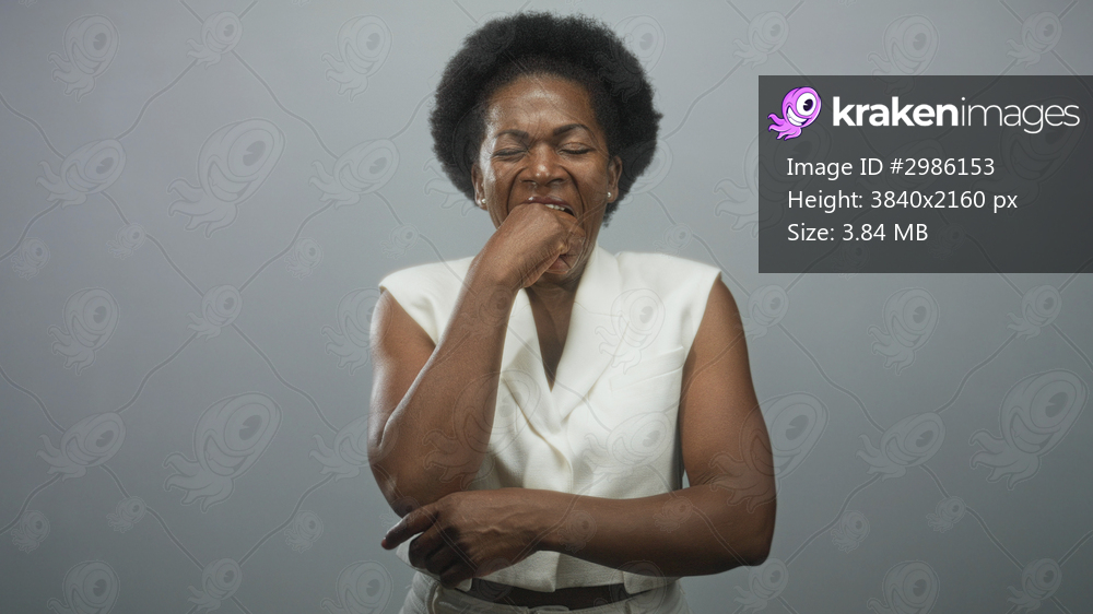 Woman biting her fist with eyes closed in studio, wearing white sleeveless waistcoat and belt, expression of tension and nervousness; anxiety coping resilience. - Kraken Images
