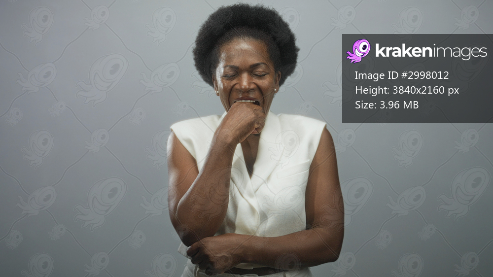 Woman biting her fist with eyes closed in studio, wearing white sleeveless waistcoat and belt, expression of tension and nervousness; anxiety coping resilience. - Kraken Images