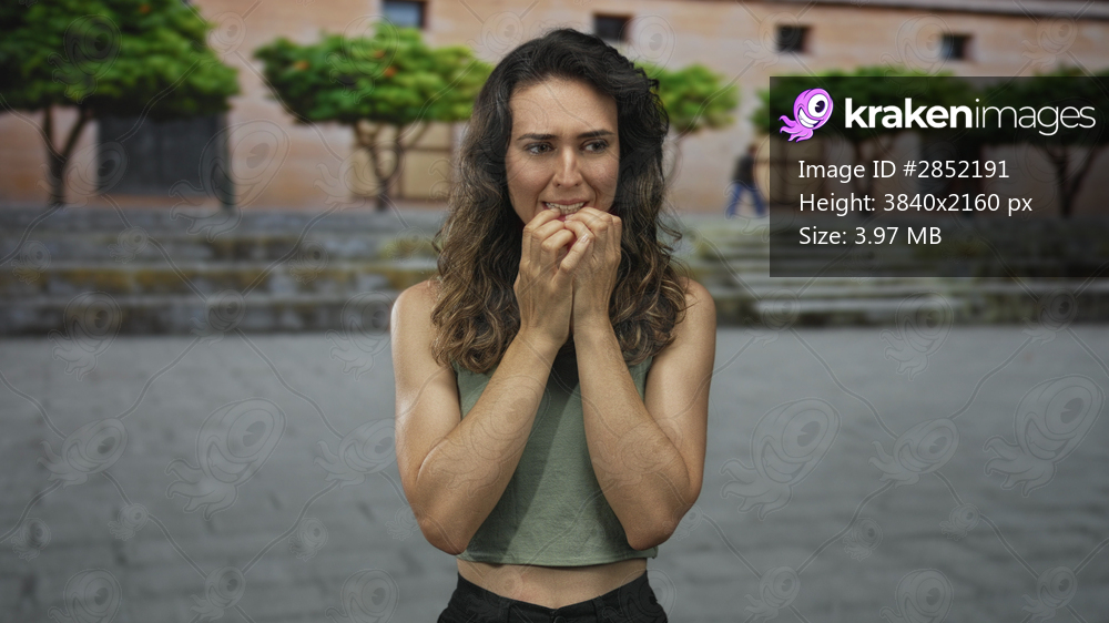 Woman biting her nails while standing on stone street steps surrounded by trees and brick building; anxiety tension uncertainty.
