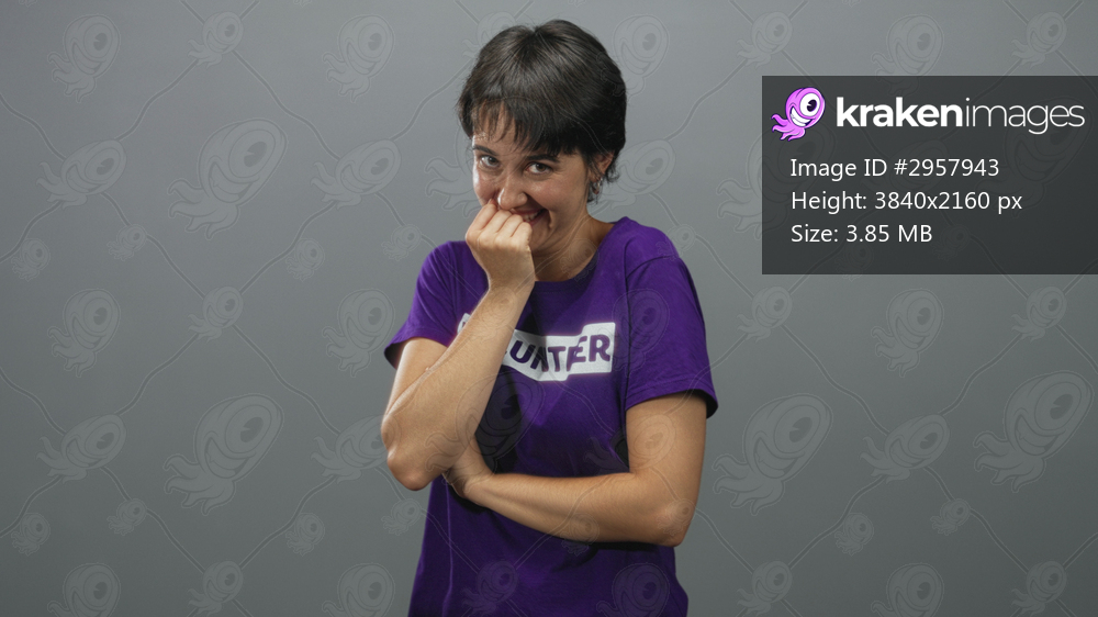 Woman biting knuckle with hand to mouth in studio wearing purple volunteer tshirt, arm folded across torso; playful shy warmth.