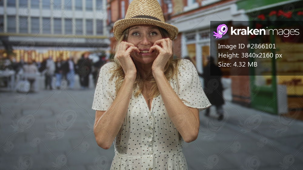 Woman biting lower lip with hands at mouth wearing straw hat and polka dot dress in street shopping area; anxiety hesitation.