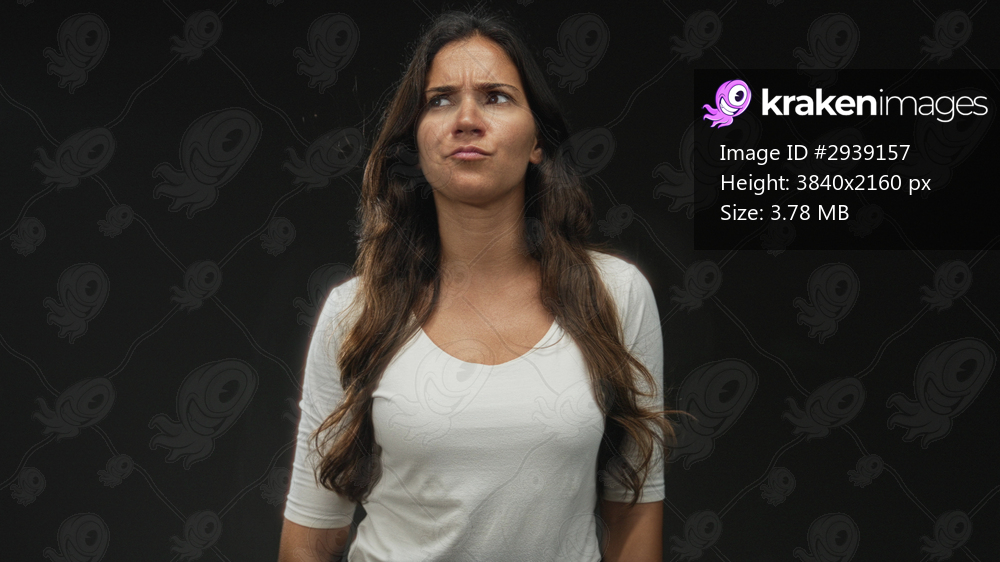 Woman biting lower lip showing bare neckline and chest while wearing a white shirt in studio with a black backdrop; skepticism.