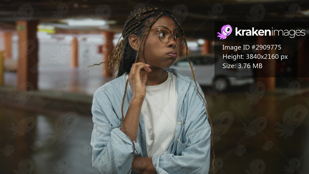 Woman biting nails with finger to mouth in parking building by parked car, wearing denim shirt and glasses, looking sideways; anxiety.