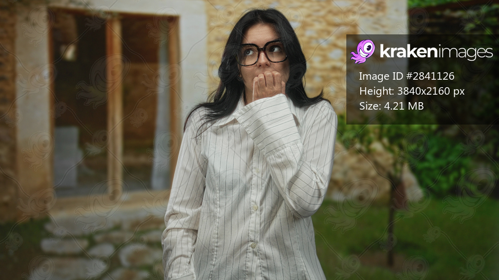 Woman biting nails gesture with hand to mouth in front of rustic stone building outdoors, wearing glasses and striped shirt; uncertainty.