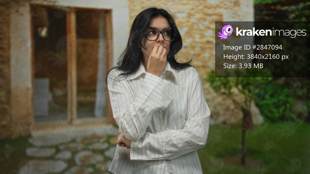 Woman biting nails gesture with hand to mouth in front of rustic stone building outdoors, wearing glasses and striped shirt; uncertainty.