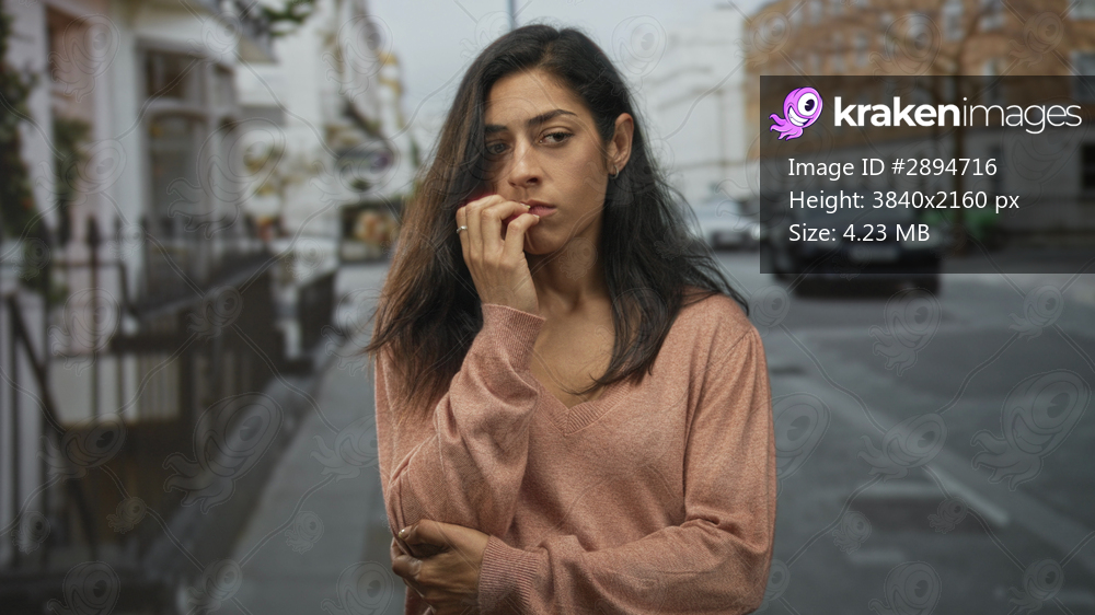 Woman biting nails with hand to mouth and arm folded on a street lined with townhouses and parked cars; worry.