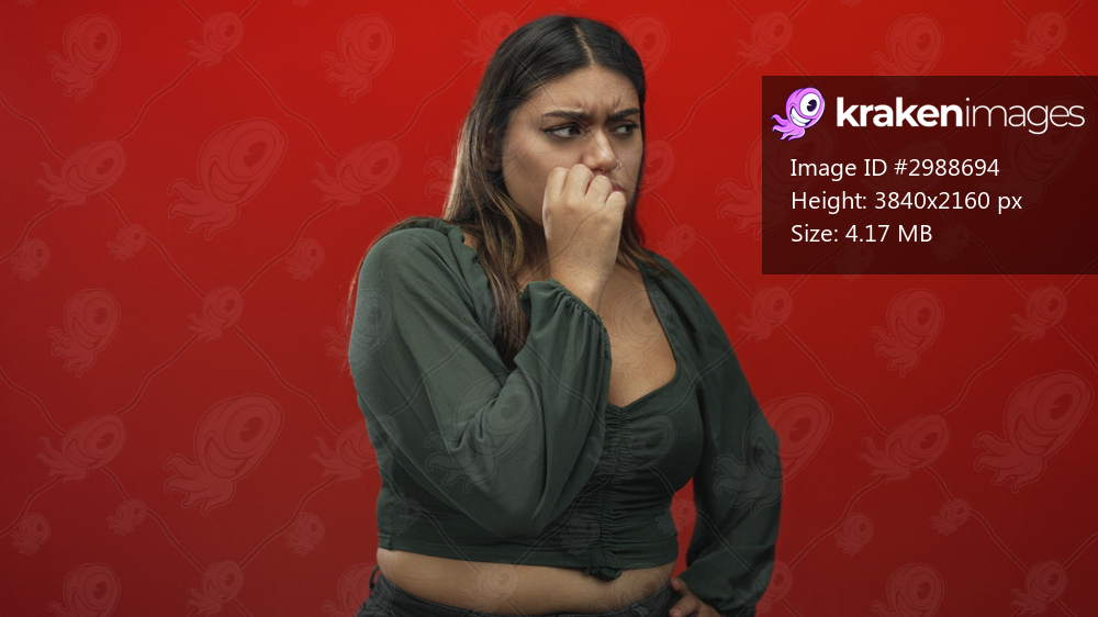 Woman biting nails with hand to mouth, frowning and pursing lips in red studio wearing green ruched top with visible midriff; anxiety doubt.