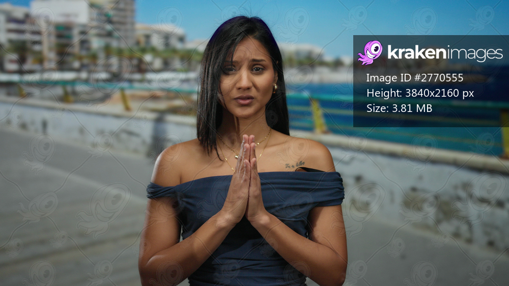 Woman with black hair praying on seaside promenade with ocean view and cityscape background on a sunny day.