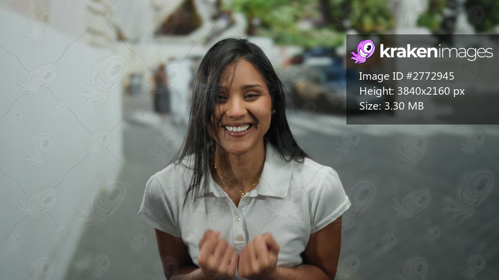 Woman with black hair smiling joyfully on a sunny outdoor street wearing a white shirt, capturing happiness and energy in an urban setting.