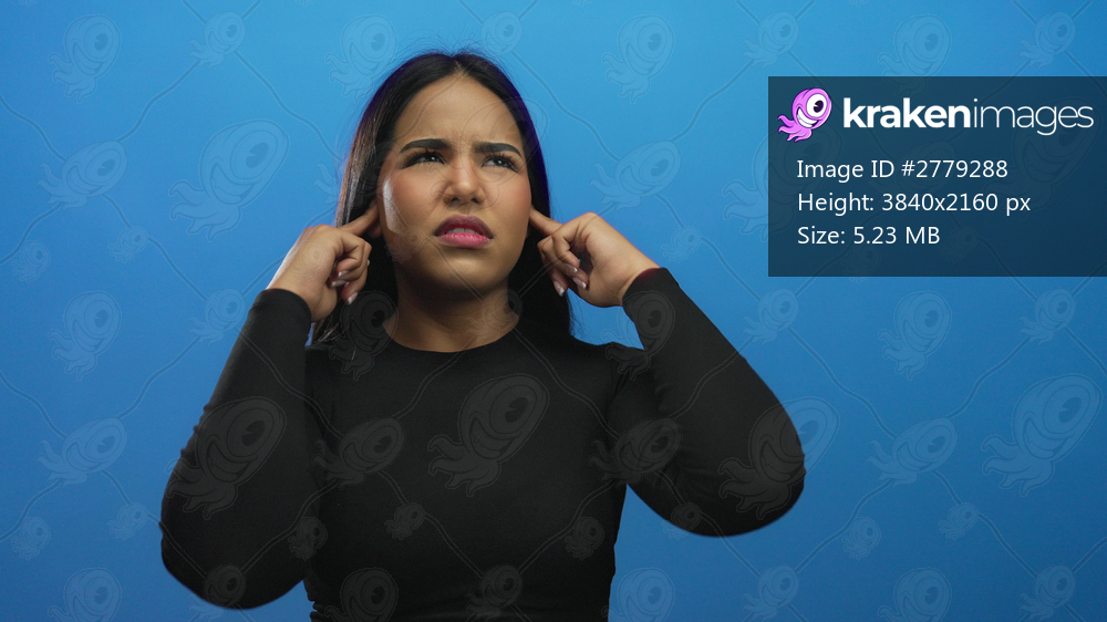 Woman blocking ears with fingers in front of a blue background showing frustration or noise intolerance with closed eyes and neutral expression.