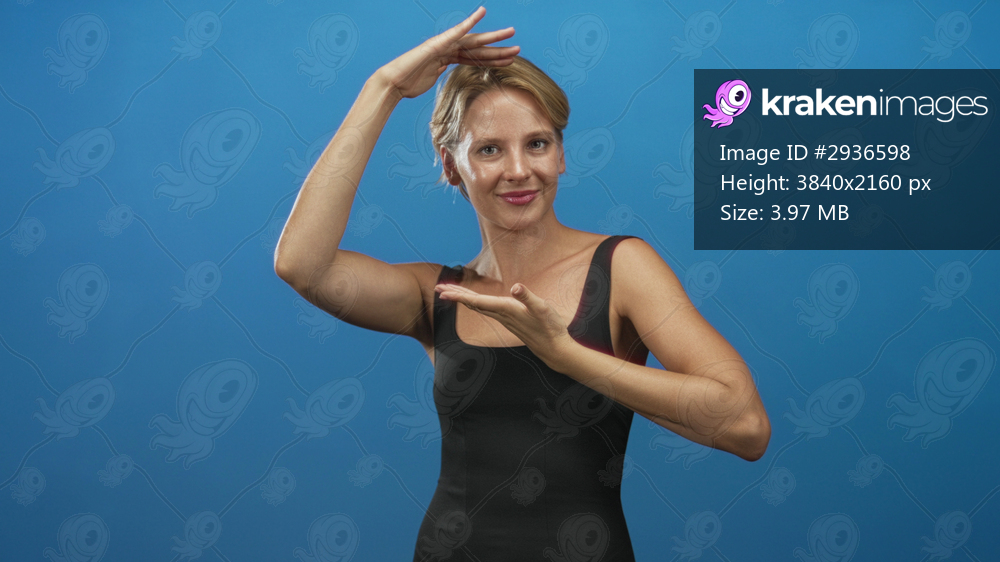 Woman blond caucasian framing her head with hands, palms up, smiling and wearing a black tank top in studio; confidence poise.