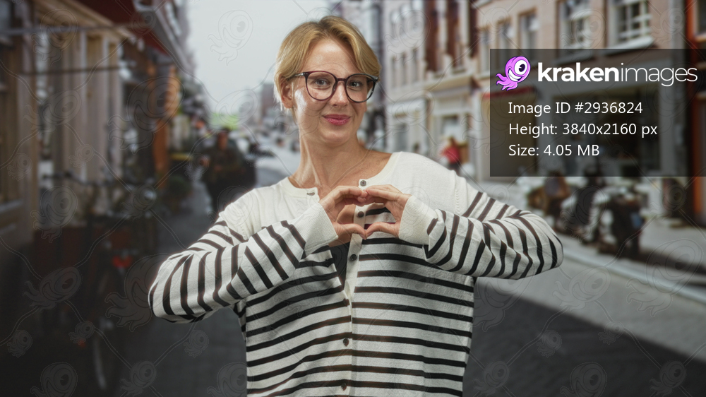 Woman with blond hair and glasses forming a heart gesture with hands while smiling in a striped sweater on a cobbled street lined with shops and bicycles; affection connection. - Kraken Images