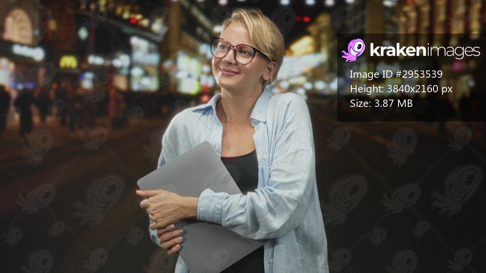 Woman with blond hair and glasses hugging a laptop close to her chest, arms crossed and eyes closed in a busy night street full of blurred shop lights; contentment security. - Kraken Images
