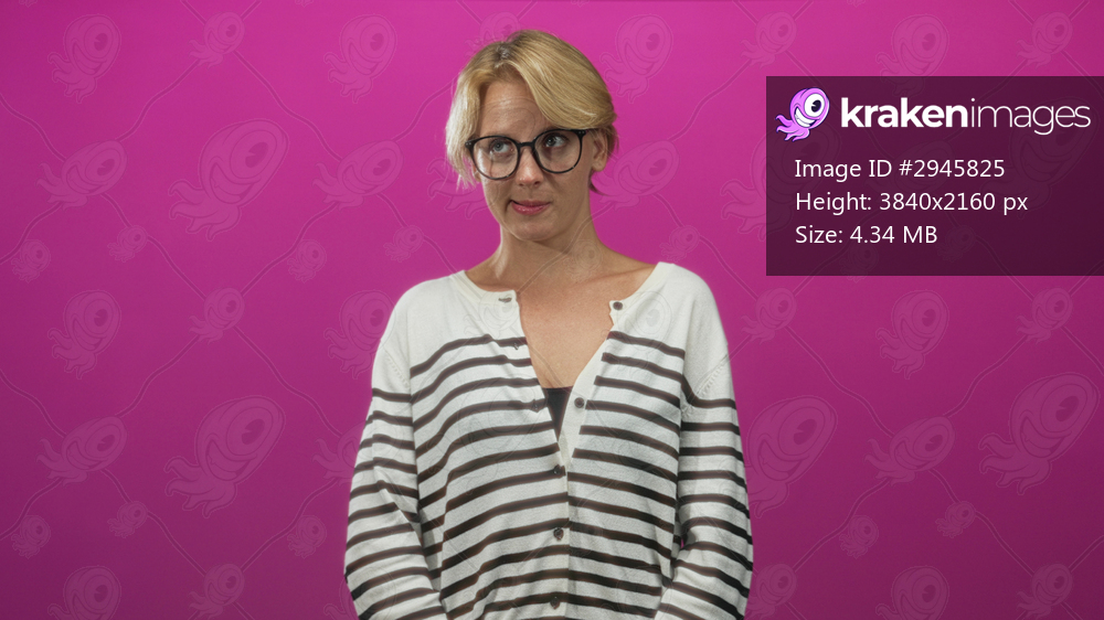 Woman with blond hair and round glasses looking down with hands clasped wearing a striped sweater in studio; quiet contemplation.