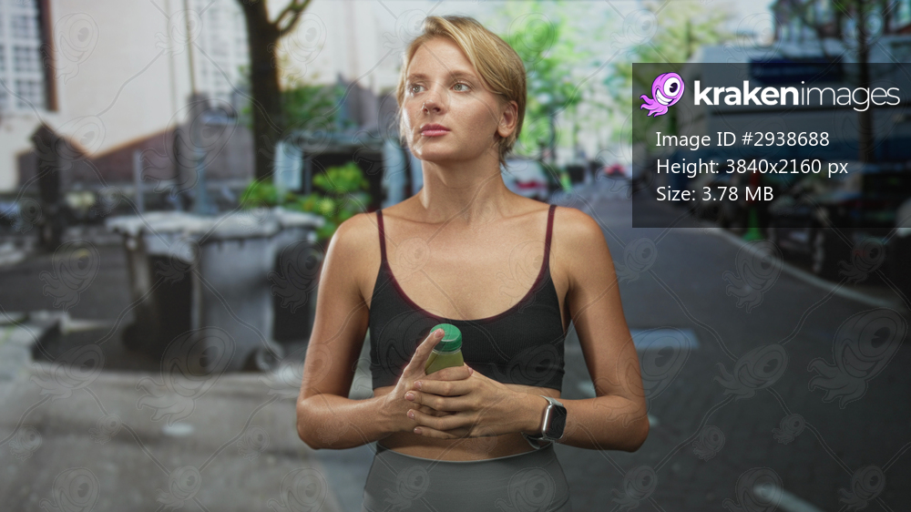 Woman blond, holding green juice bottle with hands and smartwatch, gesturing slightly while standing on urban street near parked cars and bins; focused wellness. - Kraken Images