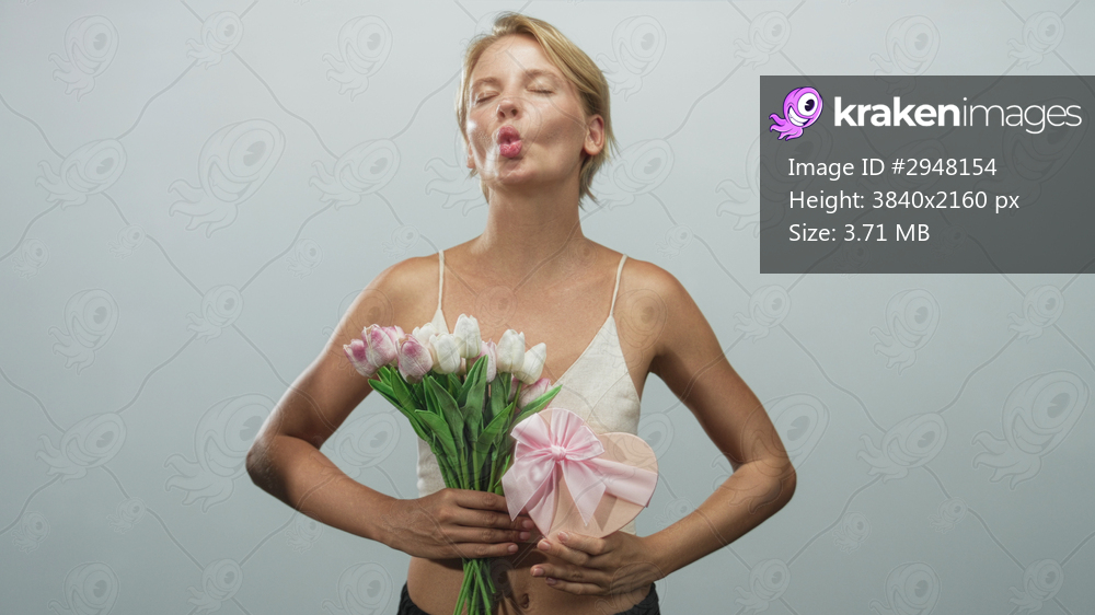Woman blond holding pink and white tulip bouquet and heart shaped gift box smiling with bare shoulders in studio; joy celebration.