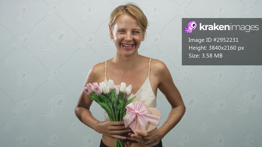 Woman blond holding pink and white tulip bouquet and heart shaped gift box smiling with bare shoulders in studio; joy celebration.