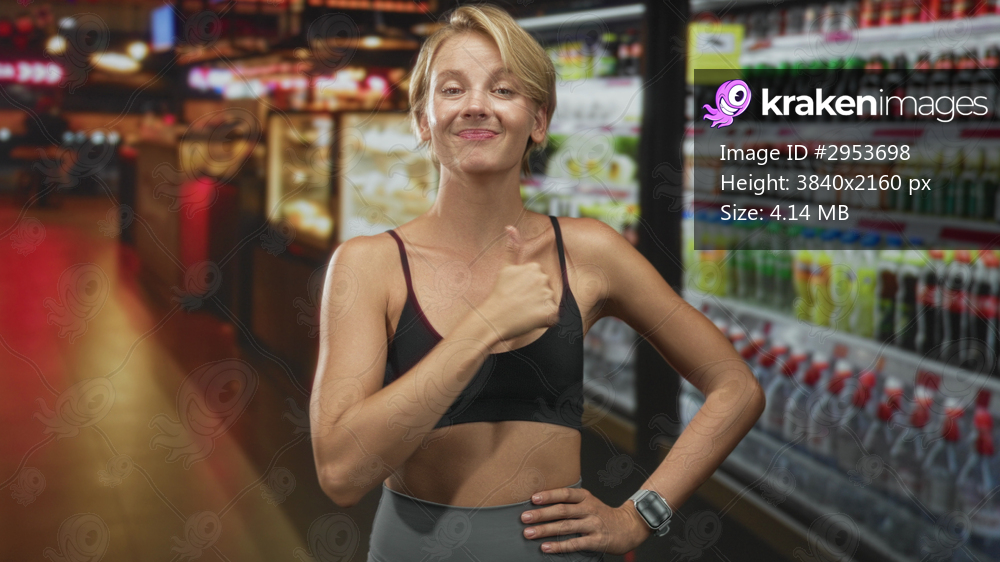 Woman blond in sports bra smiling and pointing with thumb and index finger at refrigerated beverage shelves in a grocery store building while wearing a smartwatch; confidence wellness health. - Kraken Images