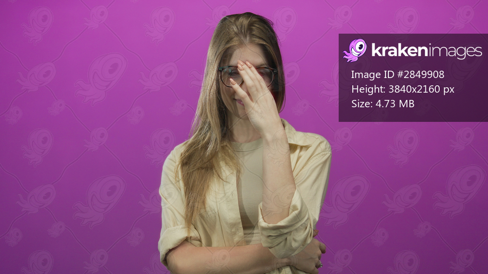 Woman blonde adjusts glasses with hand touching forehead and crosses arm in pink studio; embarrassment.