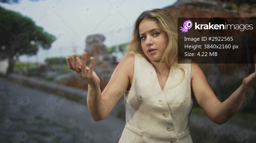Woman blonde with arms crossed and bare forearms visible wearing a sleeveless vest standing on a cobblestone street beside an old brick building and iron fence; quiet rejection. - Kraken Images