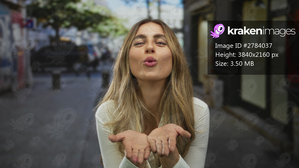 Woman blonde blows kiss with hands in city street; flirtation affection.