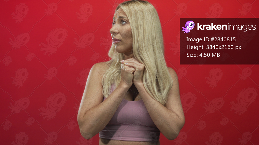 Woman blonde caucasian standing with clasped hands in red studio under even lighting showing tense stance; fear.