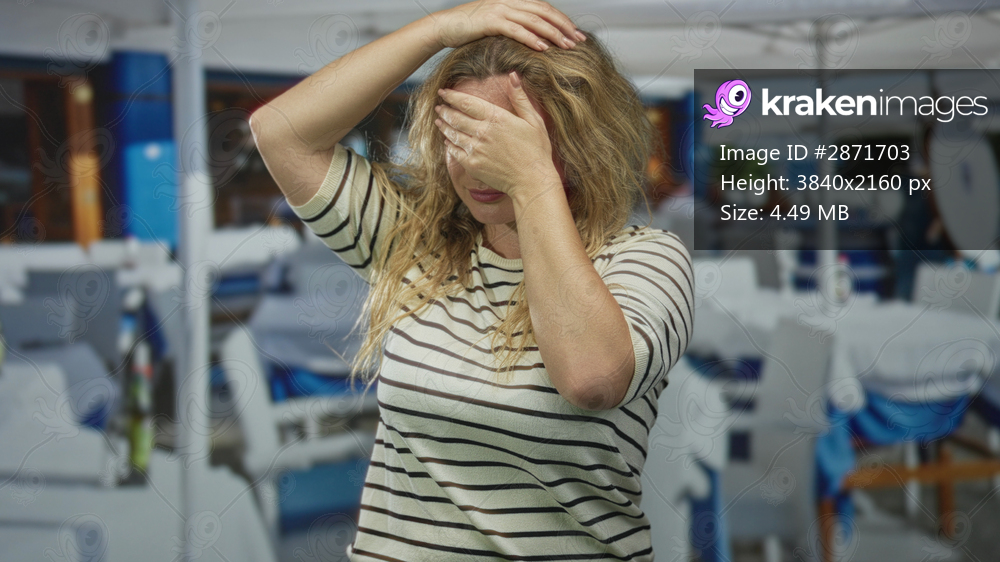 Woman blonde coughing with hand to mouth and other hand on head at an outdoor restaurant terrace under umbrella; anxiety concern.