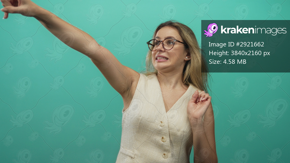 Woman blonde with glasses and beige vest pointing arm and finger in turquoise studio; surprise gesture awkwardness.