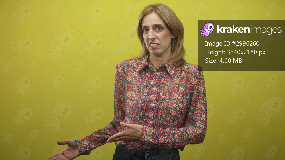 Woman blonde grimacing and pushing hand away with outstretched arm, wearing floral shirt against yellow studio backdrop; rejection.