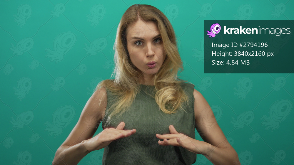 Woman with blonde hair breathes deeply, isolated against a green background, suggesting calm and relaxation, and wears a green sleeveless top.