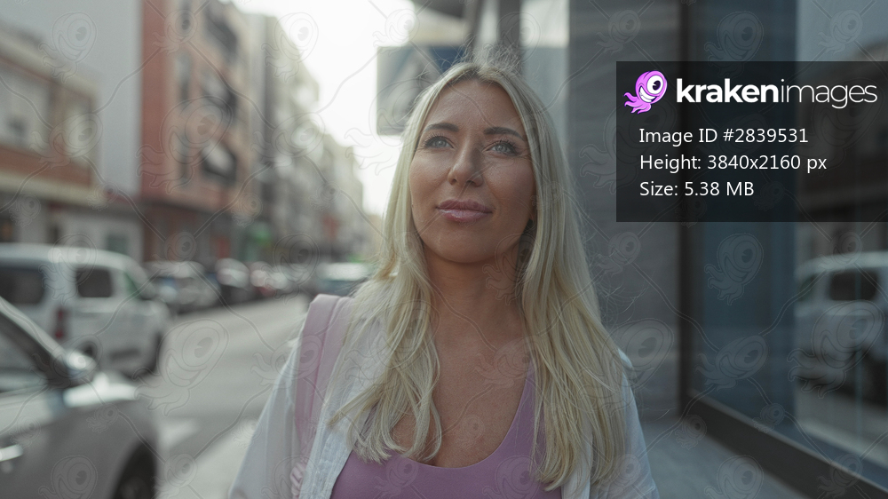 Woman with blonde hair carrying a pink backpack gazing down a city street between buildings; serenity.