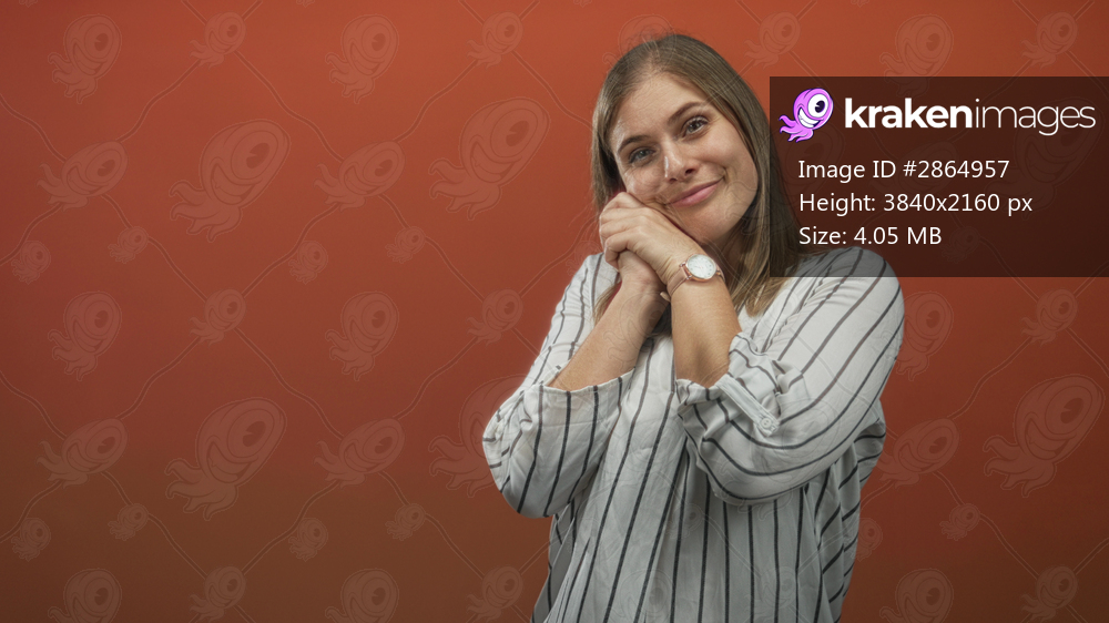Woman with blonde hair clasping hands forward while smiling gently in orange studio setting; gratitude hope.