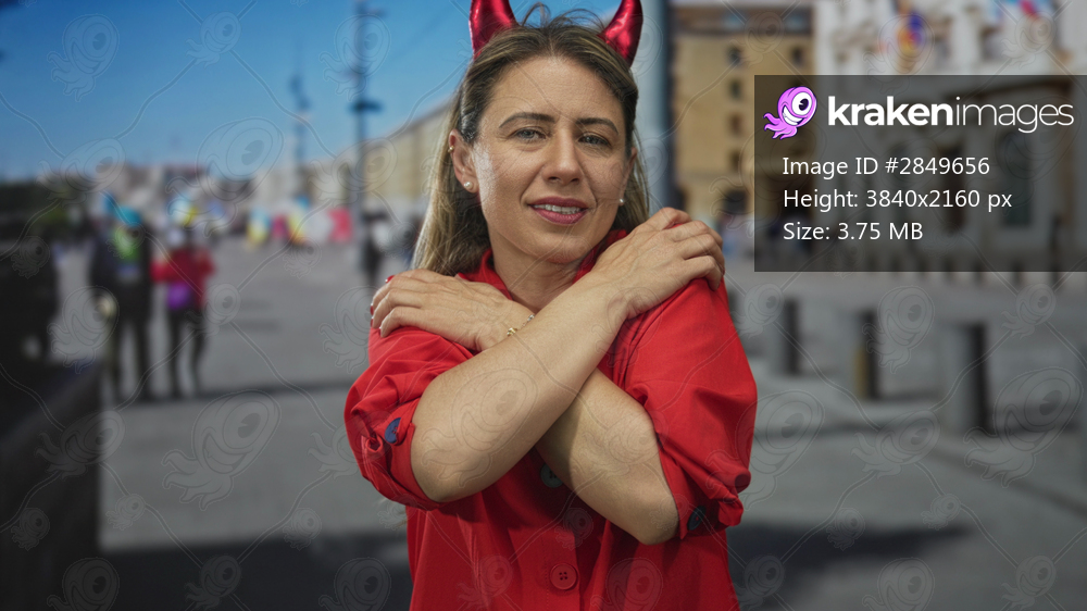 Woman with blonde hair and closed eyes in red shirt hugging arms on city street with blurred buildings; self care calm.