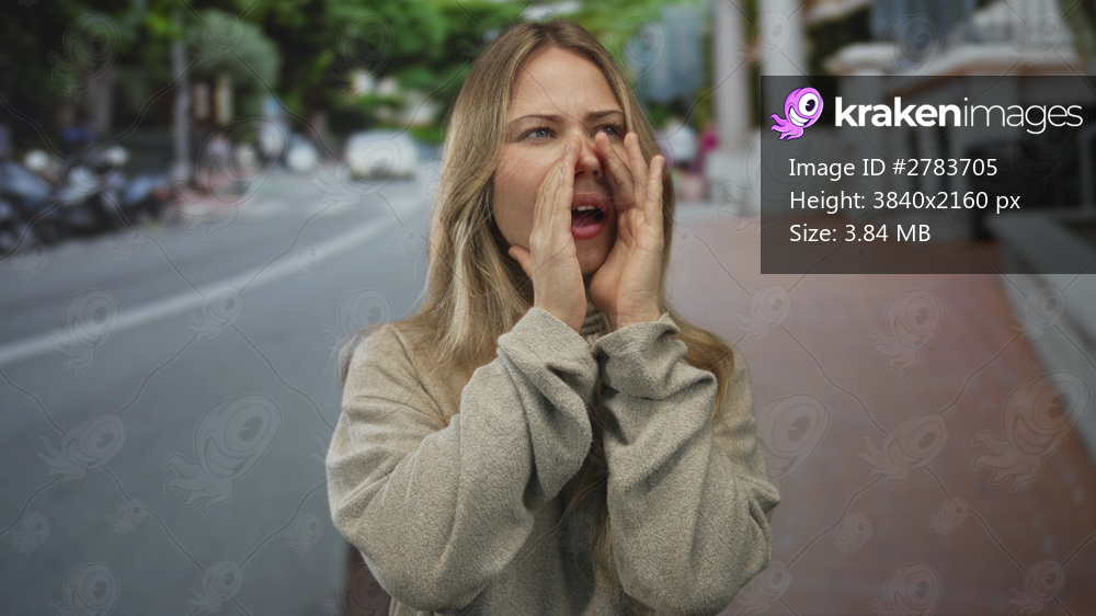 Woman with blonde hair cupping bare hands around mouth shouting on crowded urban street; urgency awareness attention alert.