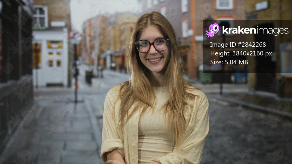 Woman with blonde hair and eyeglasses covers her eyes with hands while standing on wet urban street; playfulness.