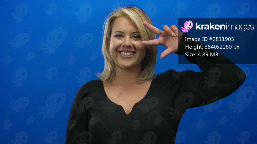 Woman with blonde hair and friendly smile makes peace sign hand gesture by eye in blue studio; happiness.
